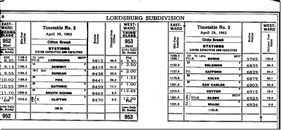 Safford is on another Southern Pacific branch that is now owned by Genesee & Wyoming Inc. The branch is not covered in the 1990 SP employee timetable, so it must have become a shortline before that. It’s fairly long at 133 miles. The website lists agriculture, chemicals and copper as the commodities carried by Arizona Eastern. Notice on the map the proximity to the Copper Basin (CBRY), San Manuel Arizona RR (SMA) and the Southwestern RR (SW), all of which are copper haulers.