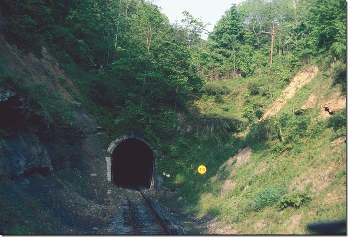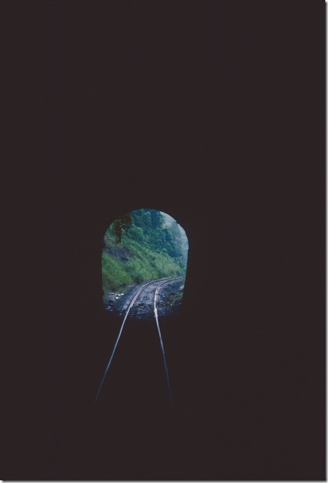 10. Exiting the west portal of Williams Creek Tunnel on manifest 391. 06-24-1985.