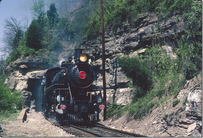 13. Passing the former L&N depot, L&N 4-6-2 approaches Frankfort Tunnel eastbound with a Louisville-to-Lexington and return excursion on 04-26-1986. L&N Frankfort Tunnel.