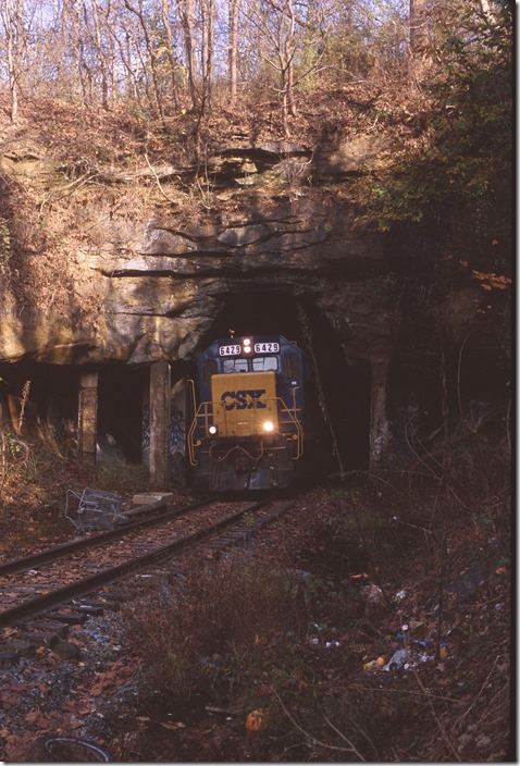 12. SBD 8509 has the westbound L&N Ravenna-to-Louisville freight at Frankfort Tunnel on 04-25-1986. The depot is just behind me. L&N Frankfort Tunnel.