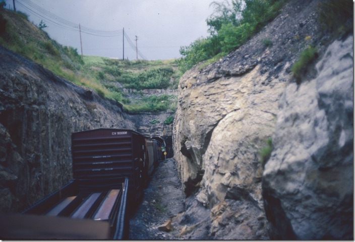 5. No. 391 westbound approaching the east portal of Princess Tunnel on 06-24-1985. Some of the tunnel had been converted to an open cut.