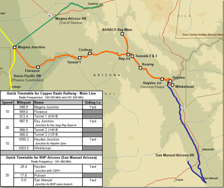 18. In the Kennecott days I’m not sure how this operation was handled. KCC had three GP39 and 39-2s (nos. 1-3) and a couple more that probably came from Utah. Presumably KCC handled the ore and concentrate, and SP came to Ray Jct. from Magma Jct. to set off and pick up everything else. I’ve seen a photo of KCC 1-2-3 at Hayden Jct. CBRY 502. Ray Jct AZ.