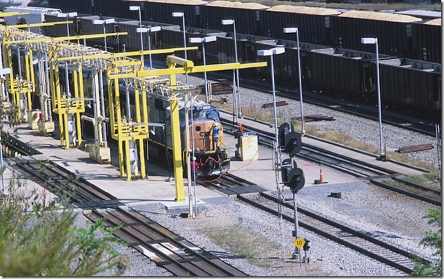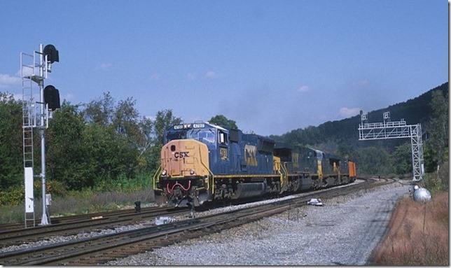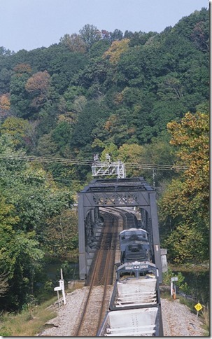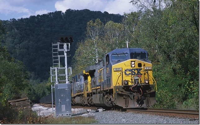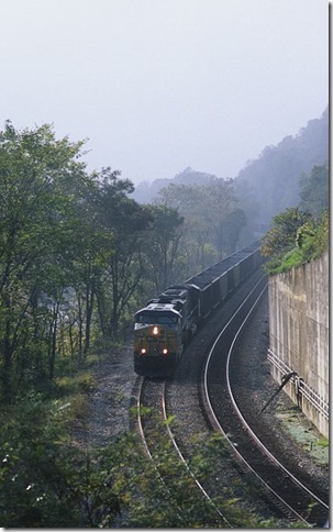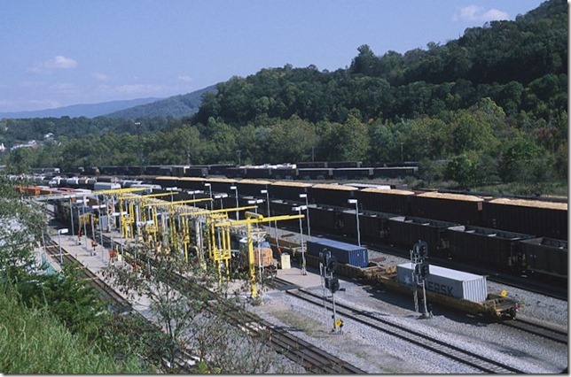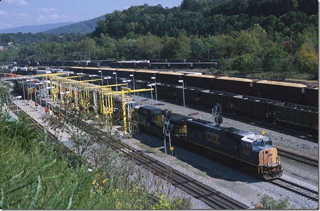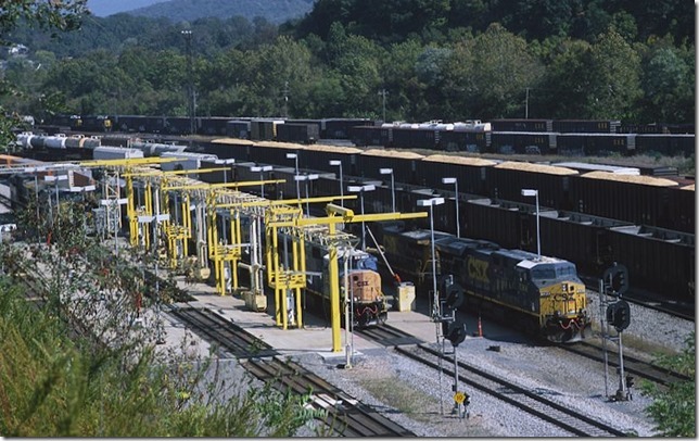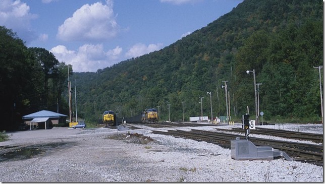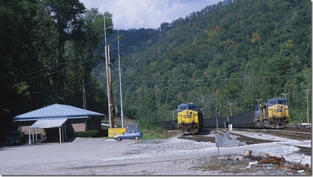 Elk Run Jct. yard at Whitesville, WV was rather quiet on 10-4-12. Locomotives outnumber vehicles parked at the yard office. Eastbounds headed by 656 and 330 are in the yard. That’s a power assisted switch on the right foreground.