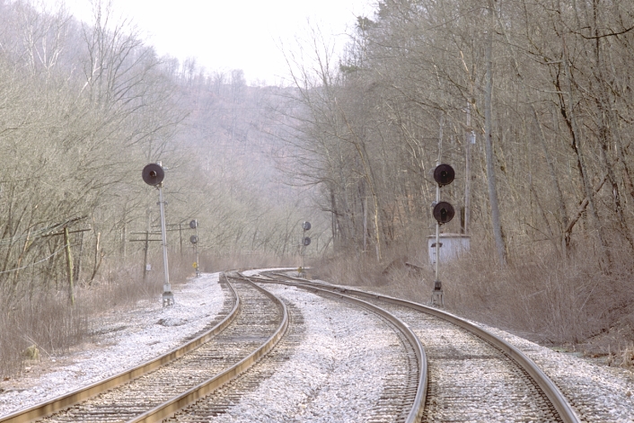 1. Pine Branch Coal's Dunraven Prep. Plant is located on top of the hill. Their siding, called Hoyt, is located a mile or so south of Dunraven. Other than through the coal company's guard gate, there's no access to the tipple except to walk the track. I parked the truck beside the twin Campbell Tunnels, grabbed a brush axe and the cameras and took off walking up the track. A short distance south is "Grimes", a single crossover that can detour a train around one loading on Track 1 at the mine.