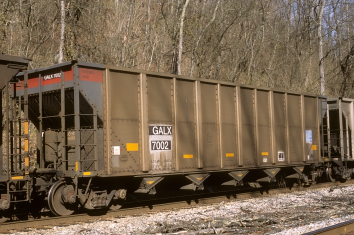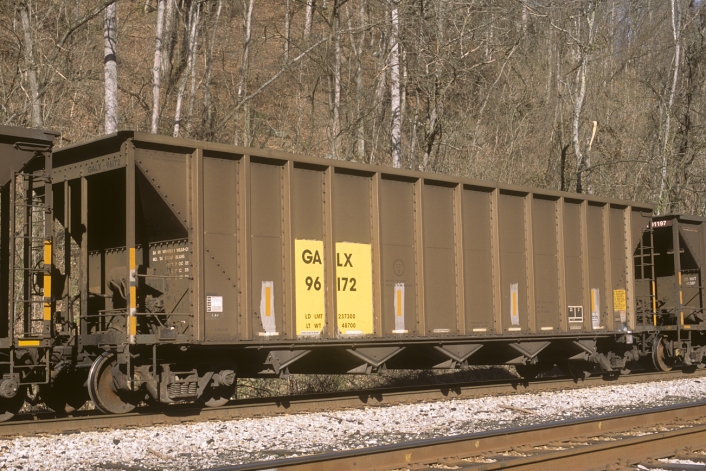 6. This train is being loaded for Georgia Power hence the reporting marks of GALX. Rapid-discharge hopper 96172 was built by Thrall in 11-96. It has a capacity of 237,300 and a volume of 4,065 cu. ft.