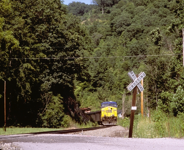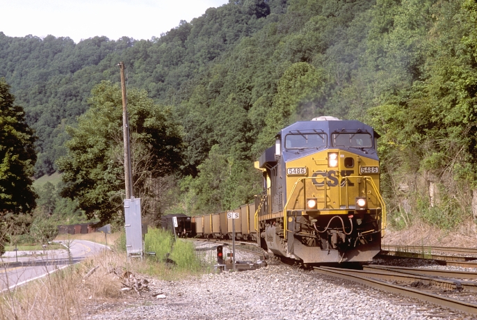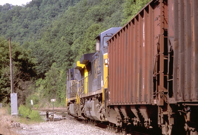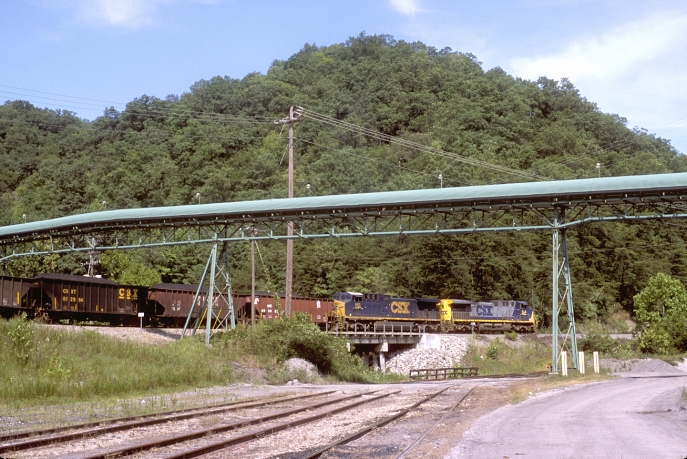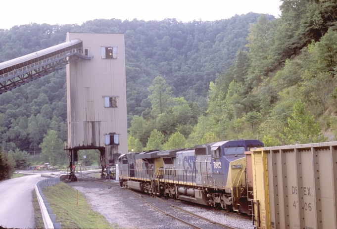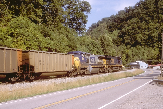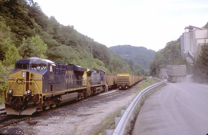 1. When things got quiet at Blackey, I figured it was time to head toward home. If I met a northbound train, the sun would be right. The scanner was silent until I got to Deane. The train I had shot in late morning -- C640-16 -- had stopped at Deane, and was just starting to move. CSX 524-563 are starting to move up the stiff grade with the aid of helper C240-16. The sidings and overhead conveyor are part of the Rapid Load plant. Consolidation Coal of Ky. recently sold this operation, and now it is called Deane Processing. C640 is now on the Elkhorn & Beaver Valley Sub. of the former C&O.