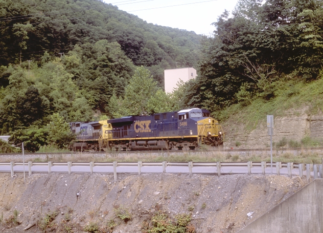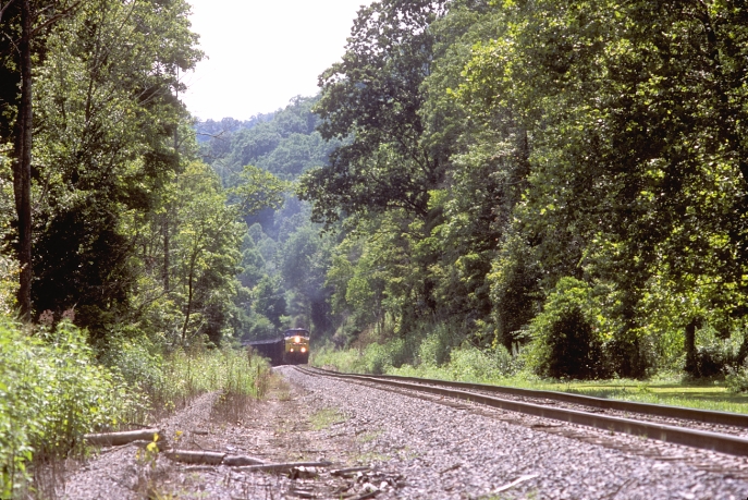 6. C884 with ES44DC 5486 and C40-8W 7802 pull east past the wye at the mouth of Bates Branch. Just in front of the engines you will notice a rise in track elevation. This is the beginning of the climb up to Beaver Gap.
