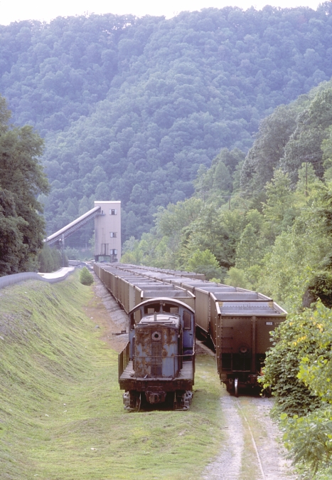 8. With the aid of a utility brakeman, the train is all in the sidings above the tipple and almost ready to start loading. The derelict ALCo switcher was used when the plant first opened in the '80s, but obviously has not been used in many years.