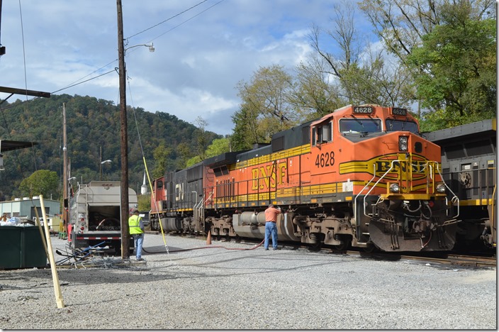 13. BNSF Dash 9-44CW 4628-CN 5788 being refueled on ready track. Shelby. 10-12-2014.