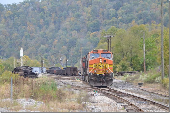 16. Heading east around the thoroughfare track to the east end of the yard. BNSF 4628-CN 5788. Shelby.