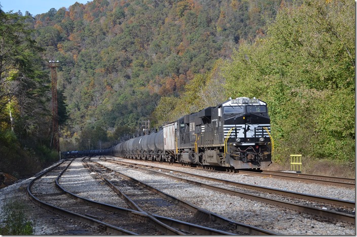 20. NS 8126-6932 with southbound ethanol train on main line waiting for a crew. Shelby. 10-19-2014.