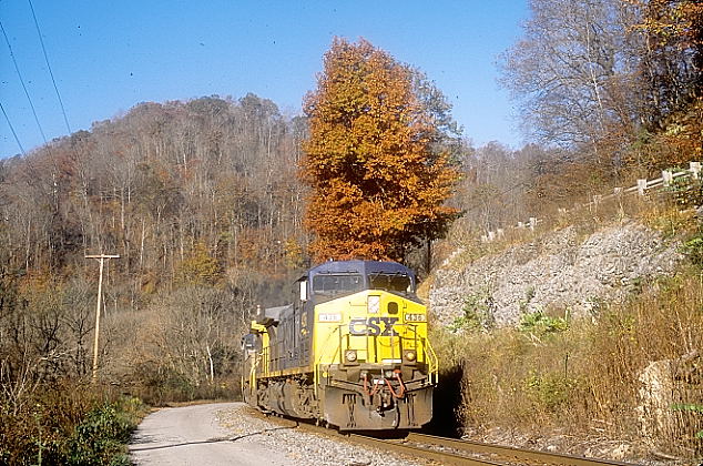 5. On Nov. 2, 2011 I took a day of vacation and headed to the EK around Hazard. Near Martin I overtook a CSX empty C842-02 with 436-54 and SCWX and ADLX cars. Just south of the KY 550/KY 7 intersection at Lackey he faced the sun, and I liked the copper-colored tree on the right.