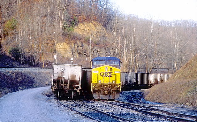 10. The sun was beautiful, but the railroad was all quiet. At Deane I found 674-5014 parked on the west end of the load tracks of the Rapid Load mine with no crew. That's the former C&O E&BV Sub. on the hill on the left. L&N's old load tracks were ripped out on the right after the merger.