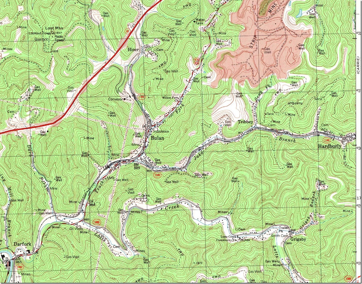 27. Darfork to Bulan, Hiner, and Hardburly circa 1992. Hazard North, KY, 1:24,000 quad, 1992, USGS. Click here for a larger image.