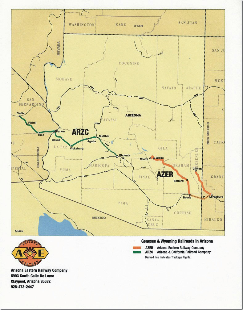 22. Just around the curve is the beginning of Arizona Eastern’s yard (ex-SP) where they interchange with Freeport-McMoRon. AZER yard. Clifton AZ.