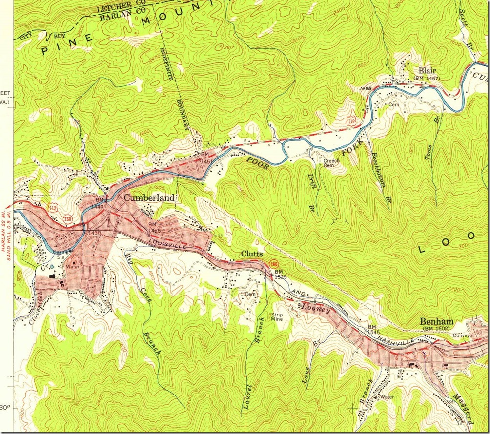 8. You can discern the wye in Cumberland. L&N later extended off this tail track to the new Scotia Mine. Benham, KY-VA, 1:24,000 quad, 1954, USGS. Click here for a larger image.