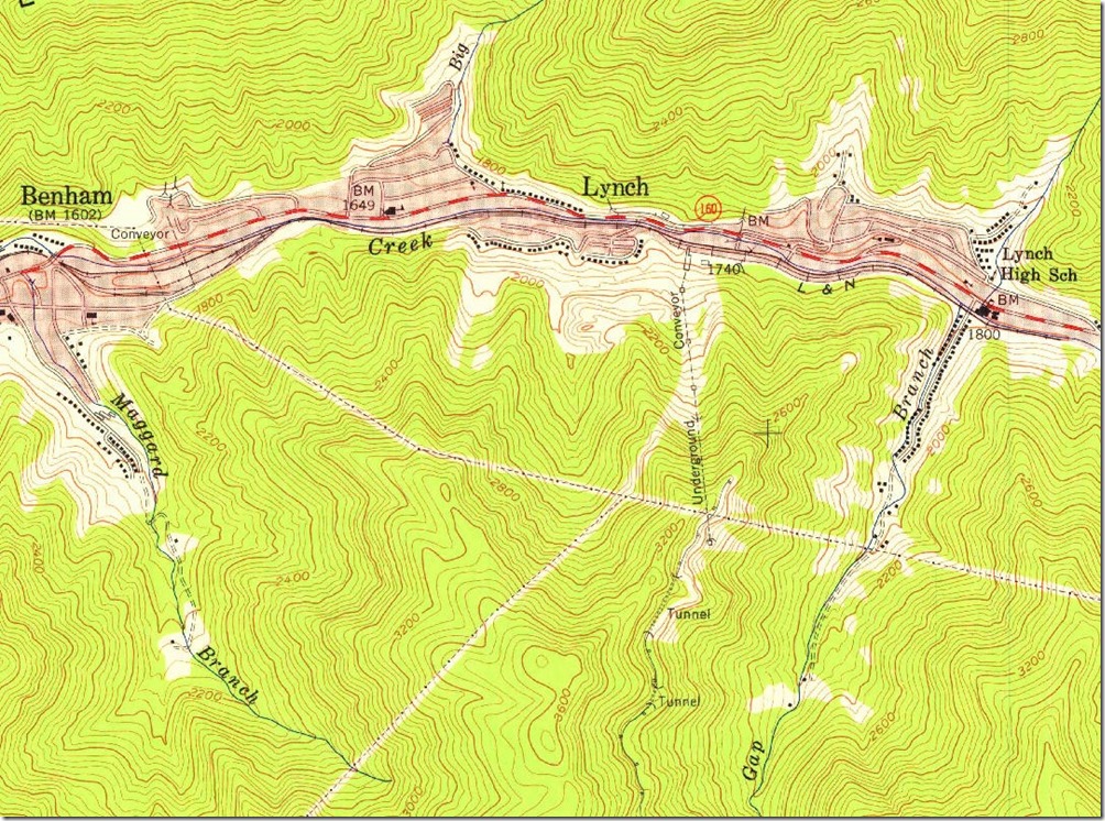 9. This shows the extent of Looney Creek from the International Harvester mine at the Benham conveyor and the USS conveyor at Lynch. This topo is circa 1954. Benham, KY-VA, 1:24,000 quad, 1954, USGS. Click here for a larger image.