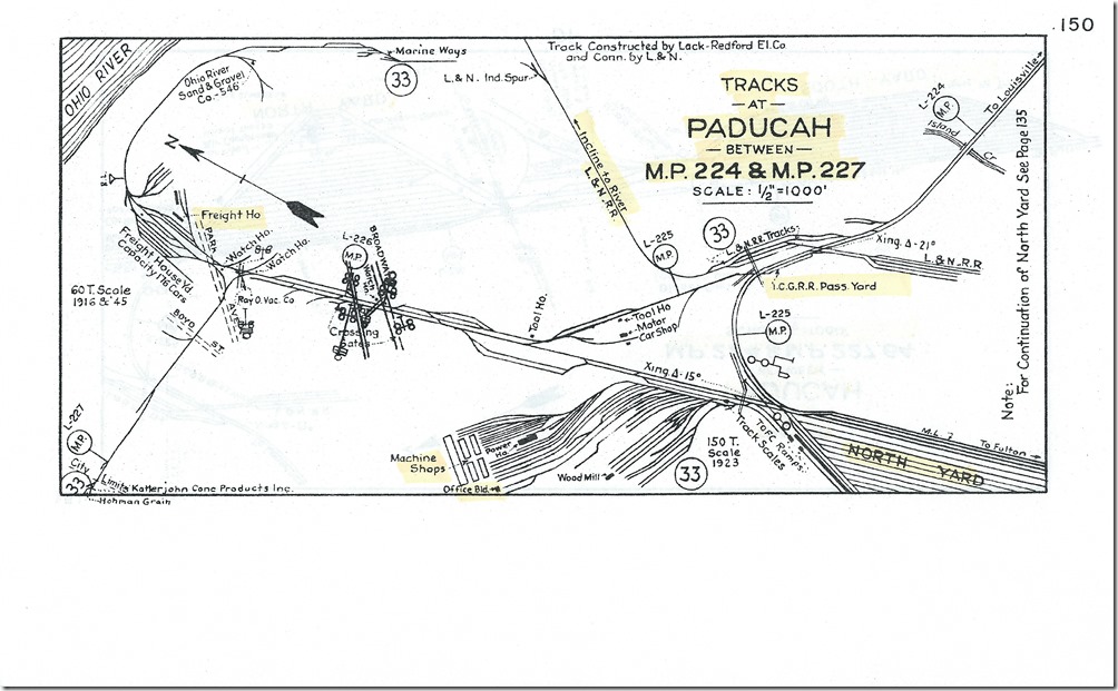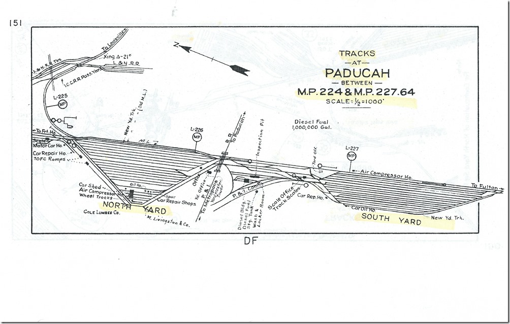 2. Paducah rail yard layout. Between MP 224 & 227.64. Page 151. Click here for larger image.