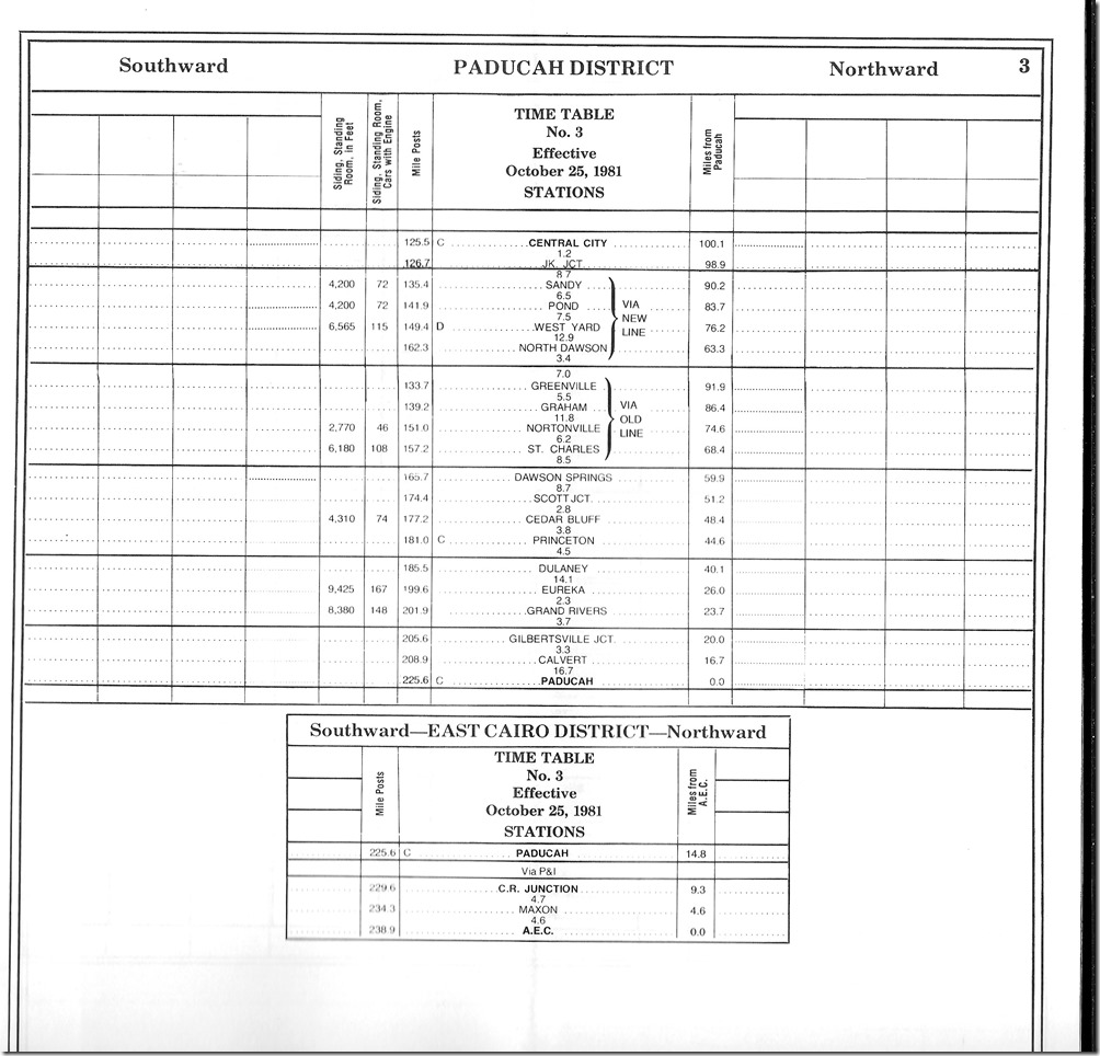 14. PAL operates the East Cairo District to the Atomic Energy Commission plant as well as the former ICG line to Central City and Louisville. Calvert City generates a huge amount of business with a coal-barge terminal and several industries. PAL runs a “Calvert Local” daily and probably keeps engines out there also. The “old line” is gone. Paducah District Timetable No 3. 25 Oct 1981. Click here for a larger image.