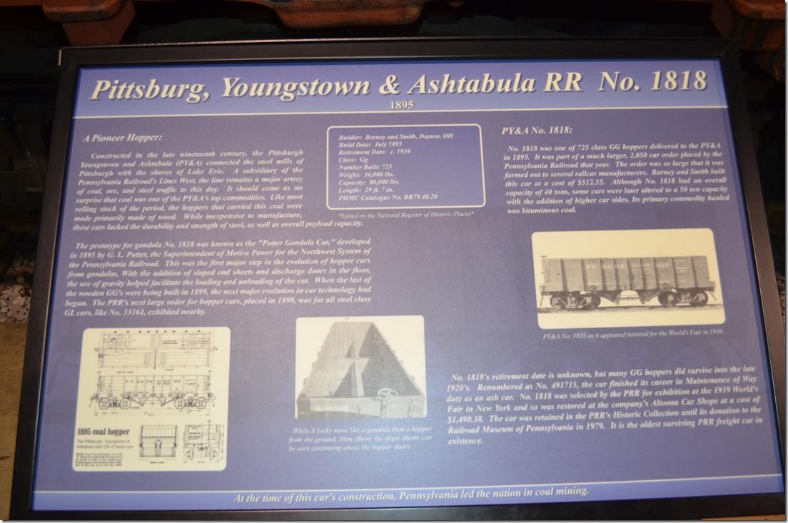 18. Pittsburgh, Youngstown & Ashtabula Ry. wooden hopper 1818. This car was built in 1895 for this subsidiary of the mighty Pennsy. Earlier pictures taken at the museum show the paint in much better condition. Evidently it was displayed outside for a long time.