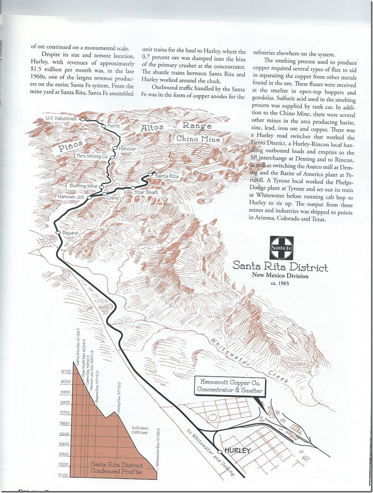 14. This map is in the First Quarter 2010 issue of The Warbonnet, The Official Magazine of the Santa Fe Railway Historical & Modeling Society. The 14-page article on the Santa Rita District is an excellent account of operations in the 1970s. The frequent mine-to-smelter shuttles ended in 1982 when Kennecott decided to move concentrated ore from the mine to the smelter through a slurry pipeline. Santa Rita Dist map. Click here to view a slightly larger image.