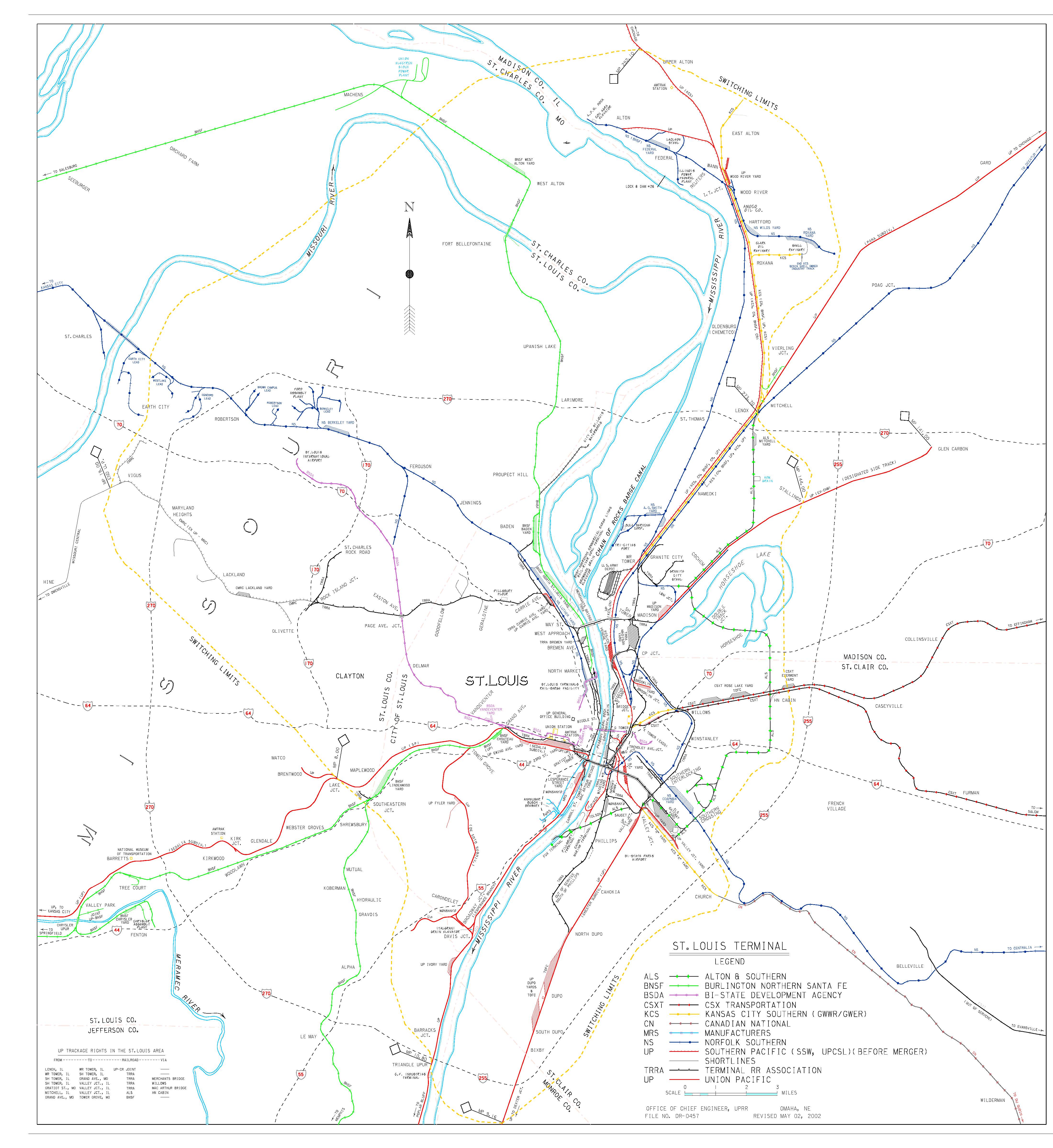 6. I don’t know whose yard or tracks these formerly were. I don’t have recent UP employee timetable of this area post the mergers with MP, SSW, C&NW, MKT etc. TRRA owns the main on the far right, so maybe they owned the yard also. UP 8643-7802 St Louis MO.