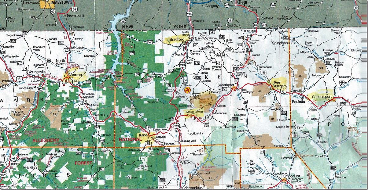 1. The towns we visited are highlighted in yellow. Routes were US 62, US 6, and US 219. PA road map Warren-Coudersport. Click here for a larger image.