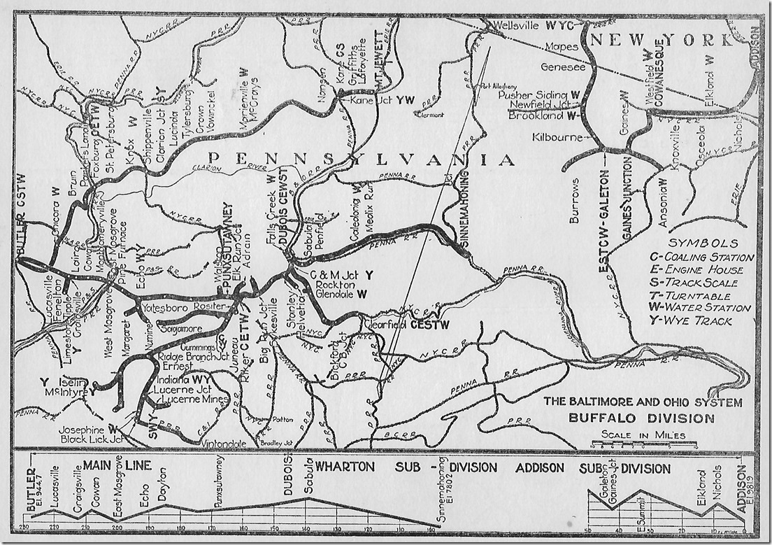 7. B&O divisional map from 1953 showing the Northern Sub. and the isolated former Buffalo & Susquehanna Railway lines out of Galeton. From B&O Time-Table #35. 1953. Wharton Addison. Click here for a larger image.