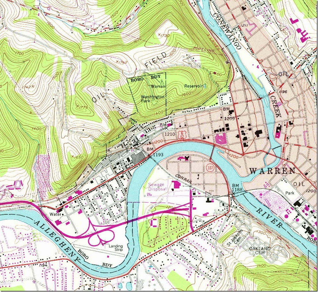 19. You can see the bridge and the B&P yard just around the curve to the west. The track extending on up through town – the former NYC Dunkirk-Titusville line -- is no longer there. Warren, PA, 1:24,000 quad, 1954, USGS. Click here for a larger image.