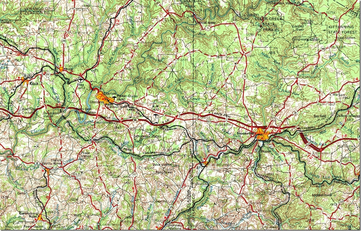 Anyway from Oil City, we continued up the scenic Allegheny River valley 57 miles to Warren on US 62. There were no significant towns except Tionesta and Tidioute. The PRR Salamanca Br. ran this route, and it was still shown in the Penn Central Allegheny Div. map in place from Oil City to Tidioute. Little evidence exists now.