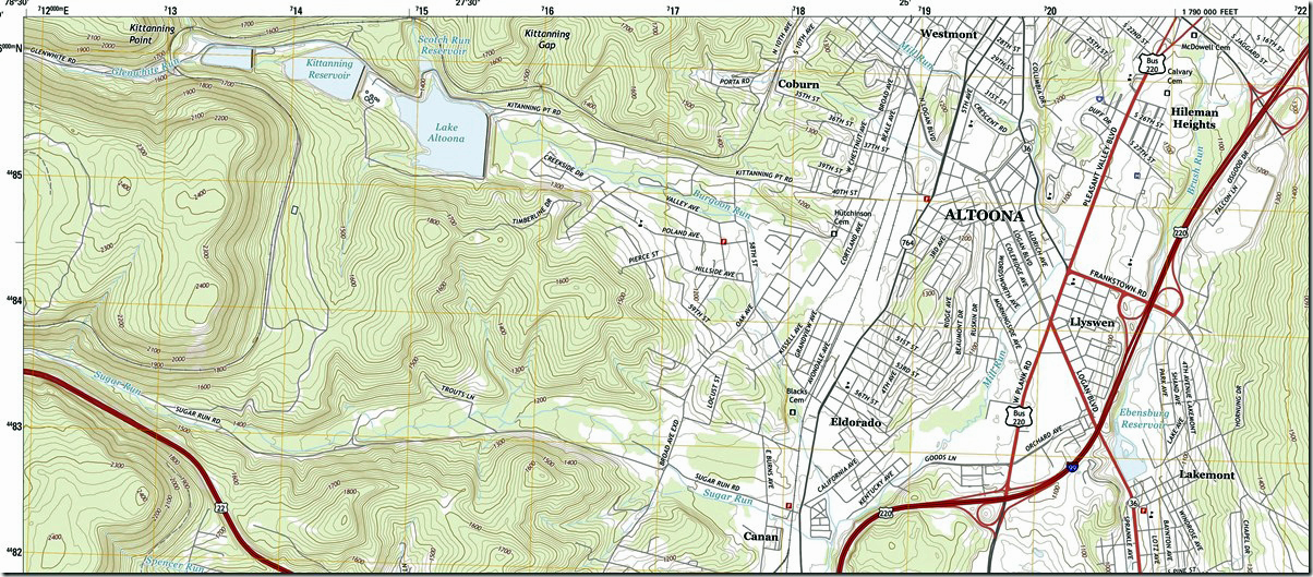 19. Holidaysburg topo 1:24,000 scale for 2016 showing climb from Altoona to Bennington curve and new US 22 coming up Sugar Run. Hollidaysburg, PA, 1:24,000 quad, 2016, USGS. Click here for a larger image.