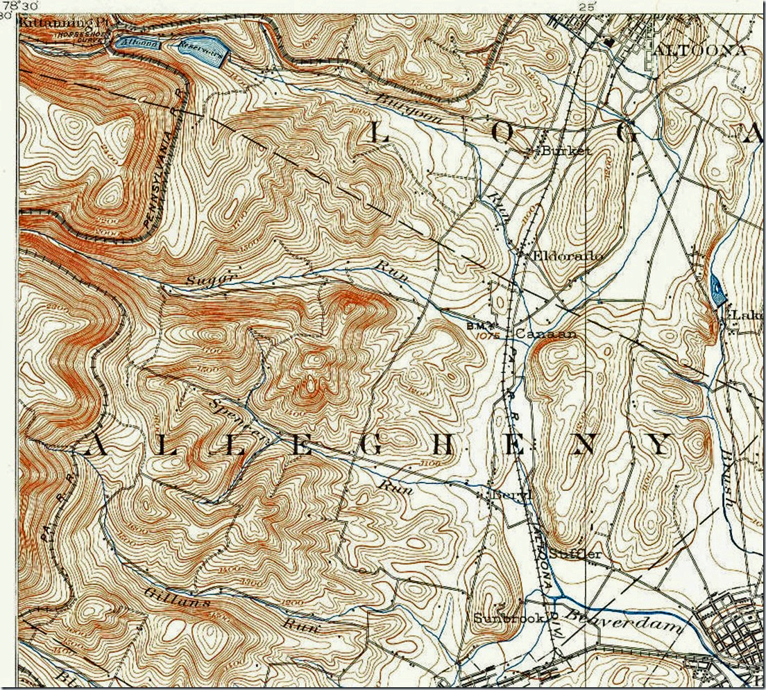 20. Holidaysburg 1:62,500 scale for 1902 that also includes the New Portage Branch (Mule Shoe curve) coming up from Hollidaysburg. Hollidaysburg PA, 1:62,500 quad, 1902, USGS. Click here for a larger image.
