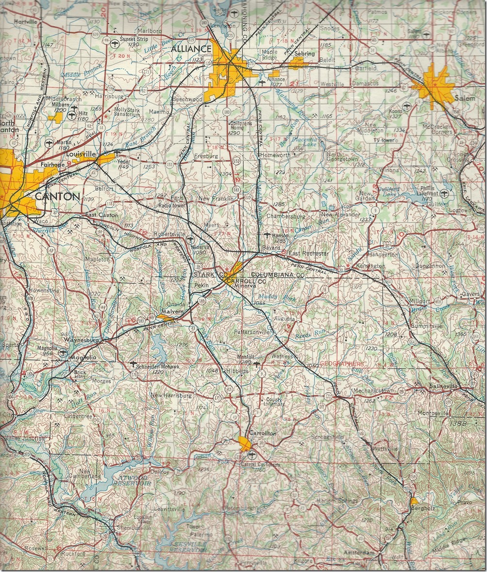 1. You can get the general idea of the location of Minerva and Alliance from this map. Generally they are east of industrial Canton. USGS Canton Quad. Click here for a larger map image.