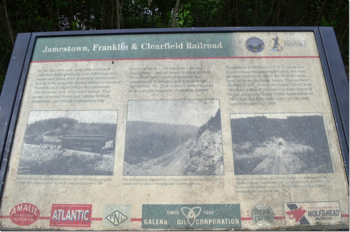 Lake Shore & Michigan Southern (NYC) operated to the north side of Oil City until abandoned in 1967. From exploring on-line websites the west end of the tunnel is partly barricaded by degree. We didn’t see it coming in on US 62. PA 8 slices around this end of the hill, and there is no evidence of this portal.