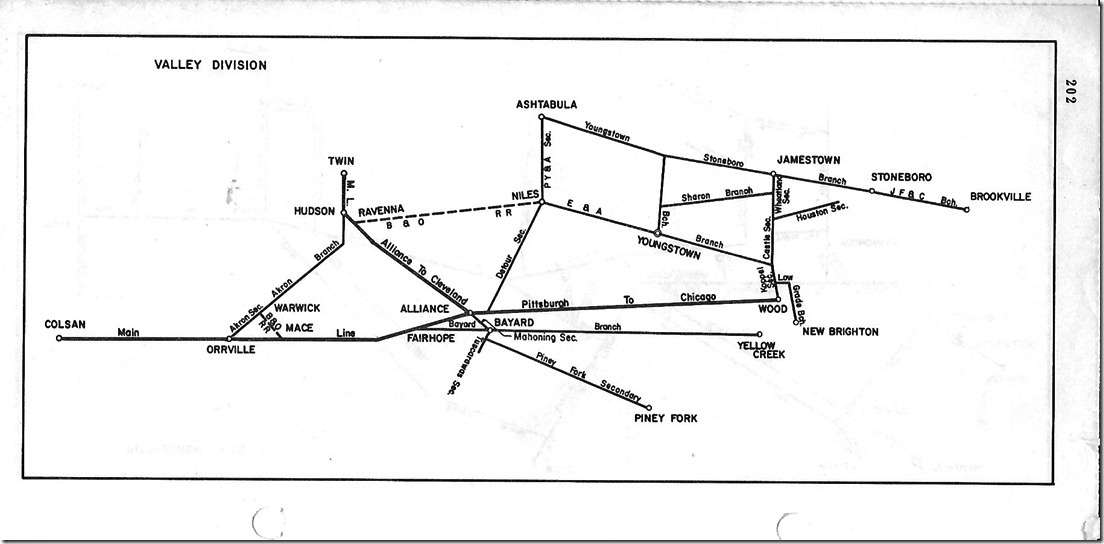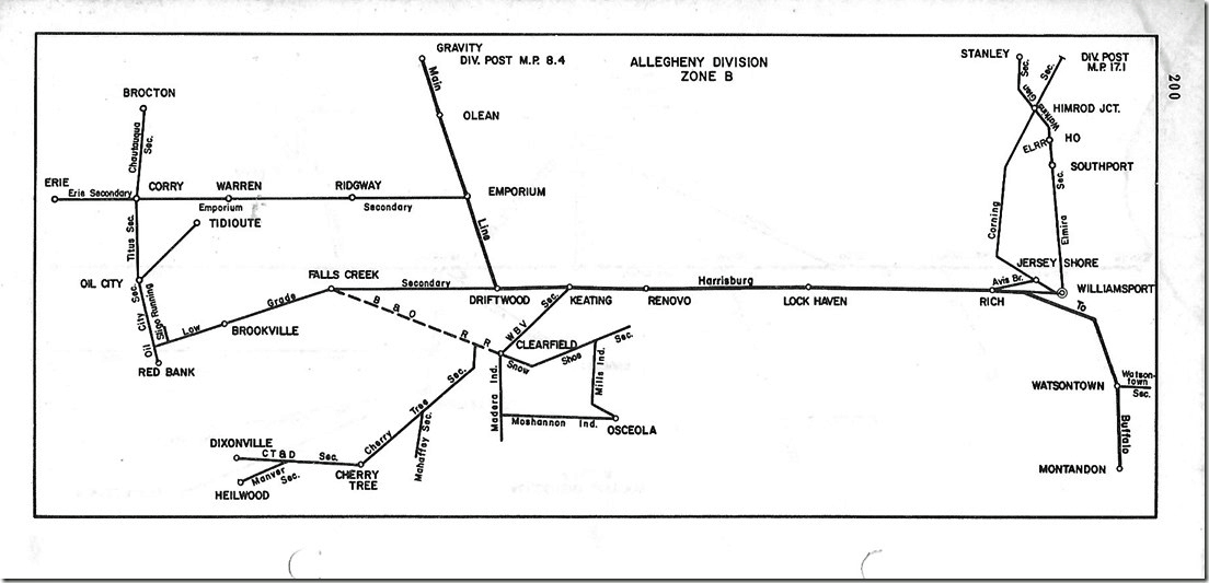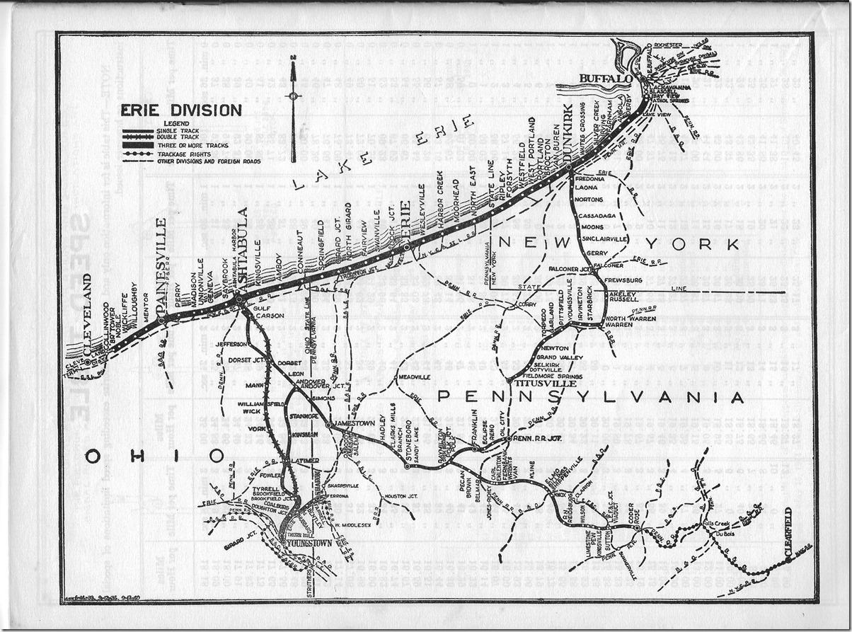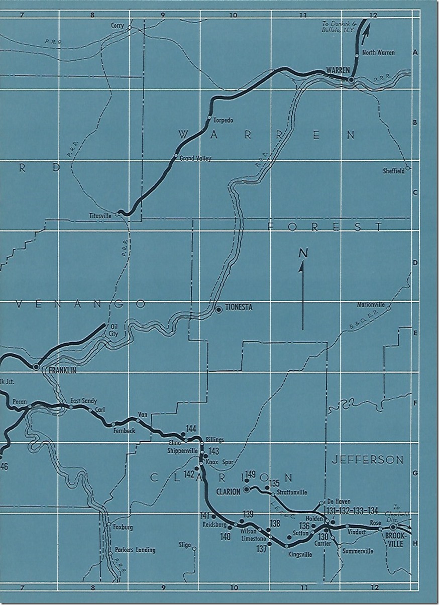 12. NYC Erie Division map from the 1951 employee timetable. The official end of the line was Rose which is on the outskirts of Brookville. Also note NYC’s connection with the Lake Erie, Franklin & Clarion (LEF&C), a coal-hauling shortline that worked until the 1990s. Also note the Erie branch coming south out of Meadville that reached Oil City. Click here for a larger image.