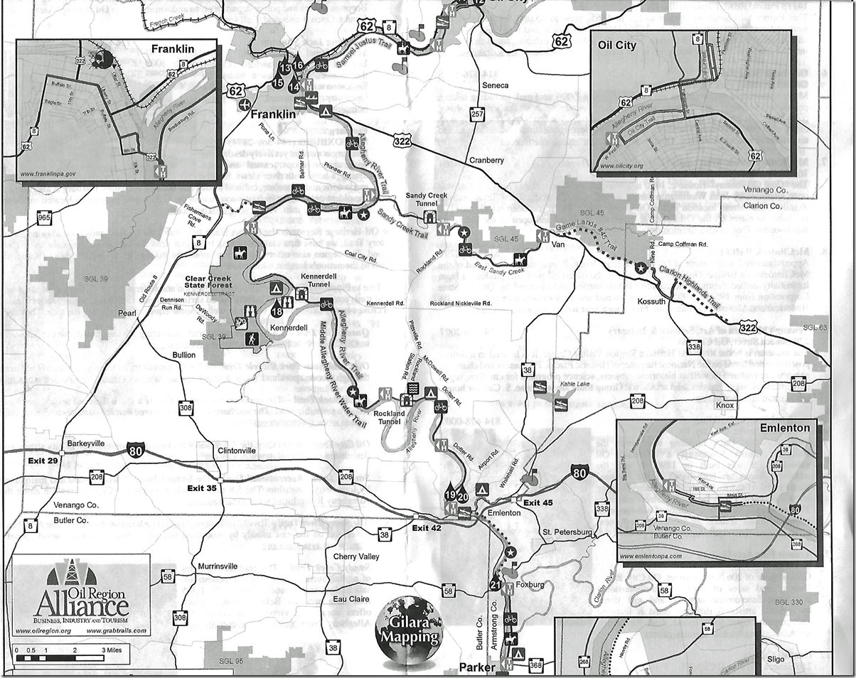 1. Bottom half of the oil region map that I inserted previously. Pay special attention to the Sandy Creek Trail (former NYC) at the end of Belmar Road and the Allegheny River Trail (former PRR). The Samuel Justice Trail out of Franklin would also be PRR. Oil Region map Belmar Franklin. Click here for a larger image.