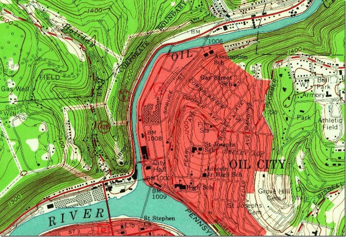 The NYC winding through town is gone, but the bridge out of town across French Creek beside PA 8 is still there. The NYC and Erie ran side by side up the narrow valley to Oil City. The Pennsy Allegheny Branch is gone. Erie depot was presumably beside Atlantic Ave. (Atlantic & Great Western RR) near the ball park.