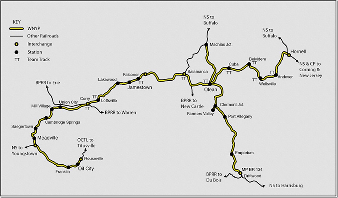 41. Map of the Western New York & Pennsylvania Railroad. The line from Meadville to Hornell NY is the former Erie-Lackawanna, nee-Erie main line. Driftwood to Machias Jct. is former NS nee-PRR Buffalo Line. Meadville (Buchanan) to Oil City is former E-L with a short segment of the PRR to Rouseville. Click here for a larger image.