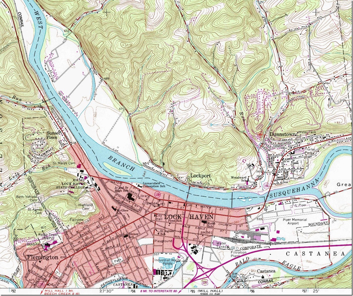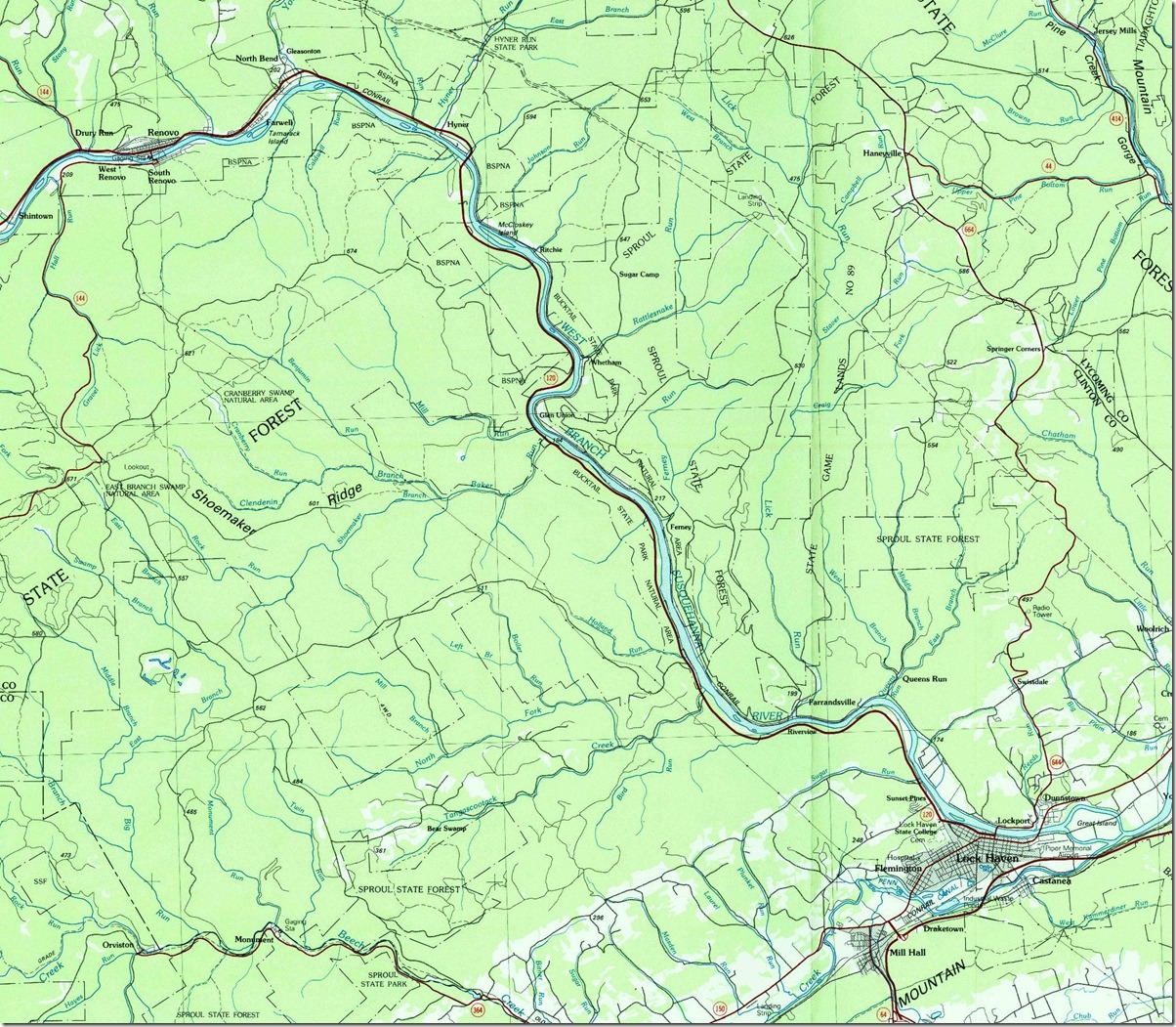 1. 1:100,000 scale showing West Branch of the Susquehanna River valley between Renovo and Lock Haven circa 1984. Williamsport West PA, 1:100,000 quad, 1984, USGS. Click here for a larger image.
