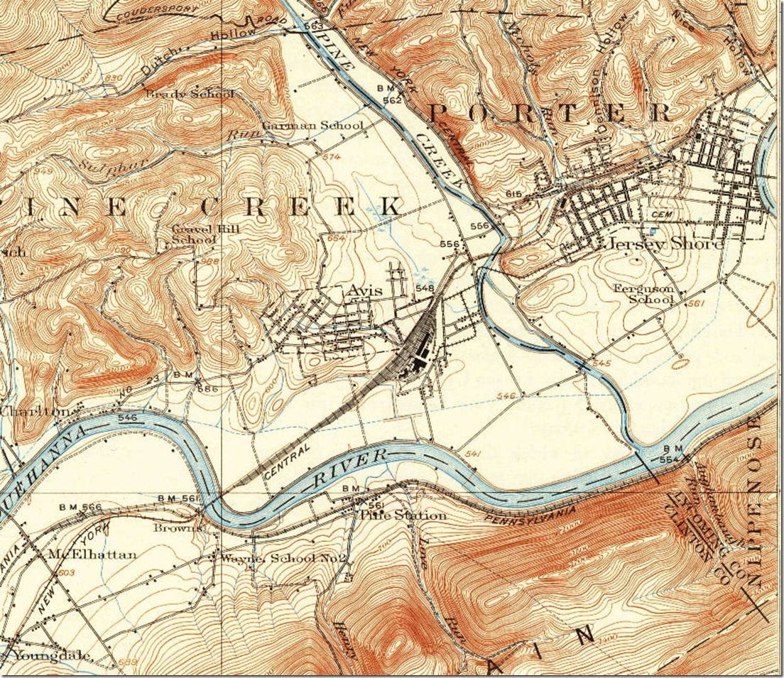 32. Could be YA Tower between Jersey Shore Jct. and Avis Yard. Stream probably Pine Creek, as it is too small to be the Susquehanna River. Note the engine on the bridge. NYC scene Avis PA 1911.