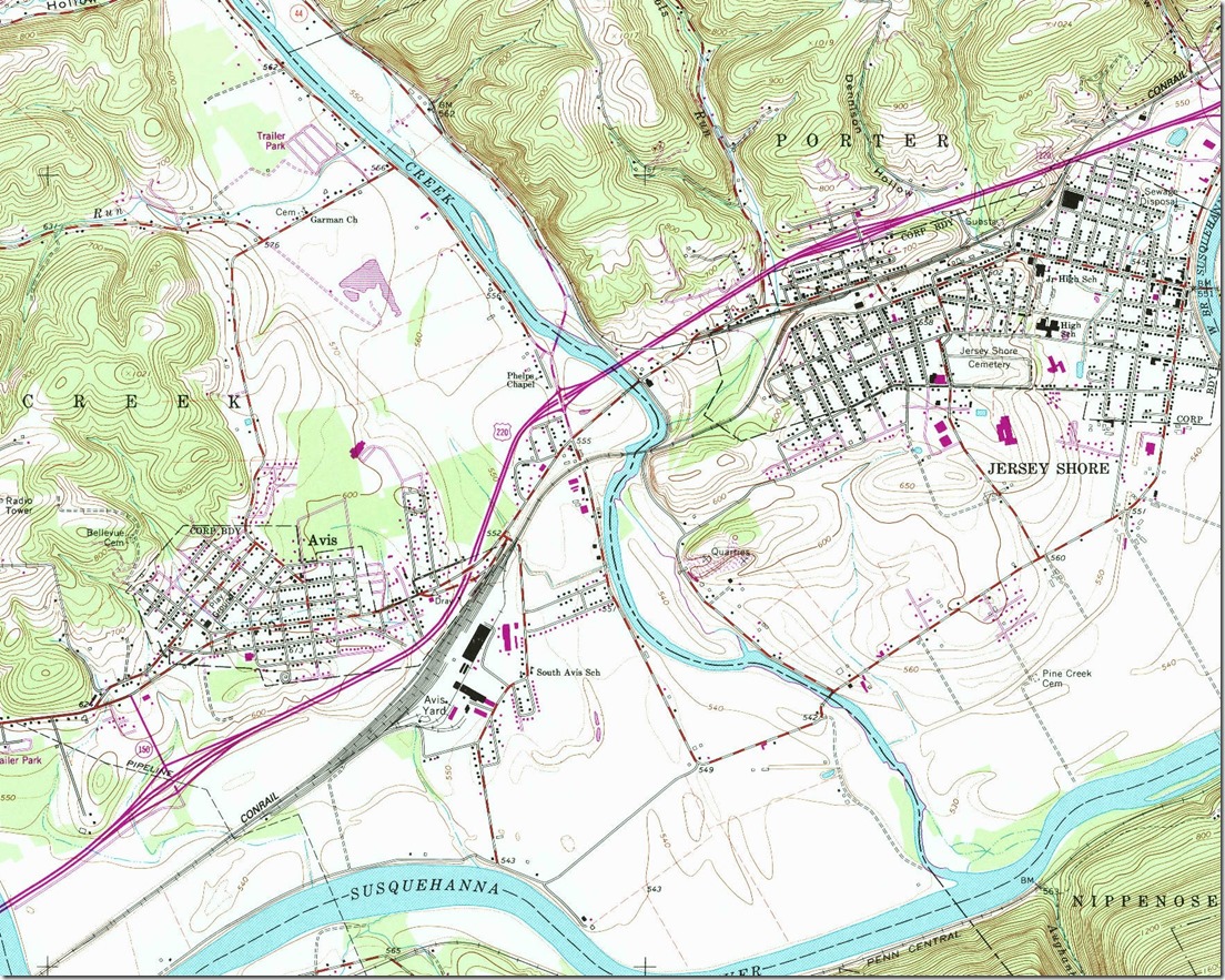 31. A more contemporary view from the Jersey Shore 1:24,000 scale 1965 updated to show Conrail, the 4-lane highway and the absence of the Corning Branch. They didn’t update “Penn Central” on the south bank of the river which is the PRR Buffalo line. Jersey Shore PA, 1:24,000 quad, 1965, USGS. Click here for a larger image.
